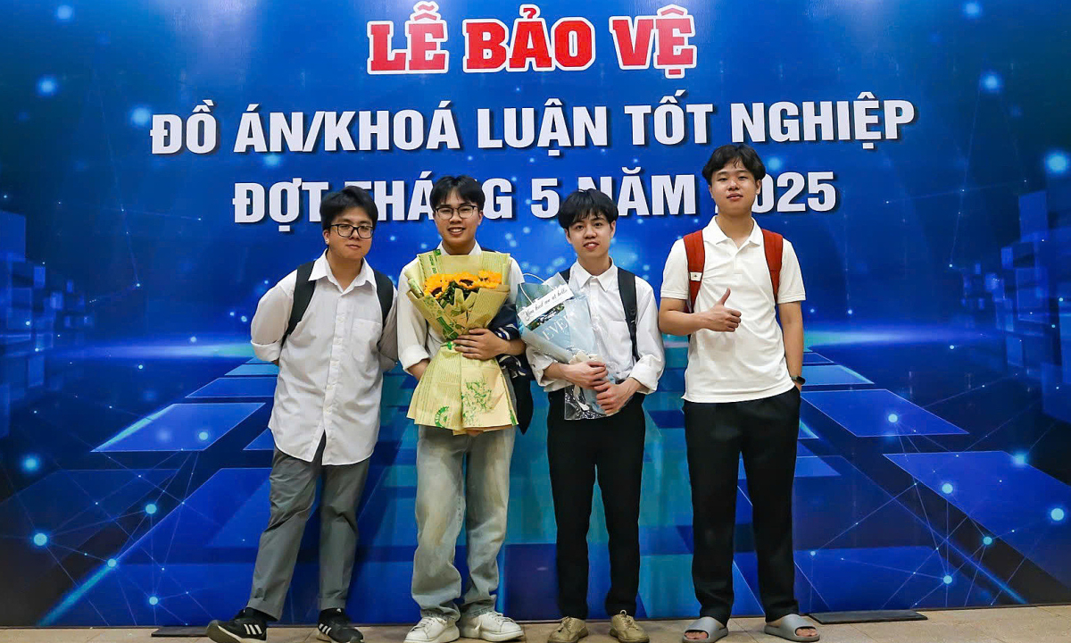 Vũ Minh Tiến (bìa trái) cùng các bạn bảo vệ đồ án tốt nghiệp sớm một năm, hồi tháng 5. Ảnh: Nhân vật cung cấp