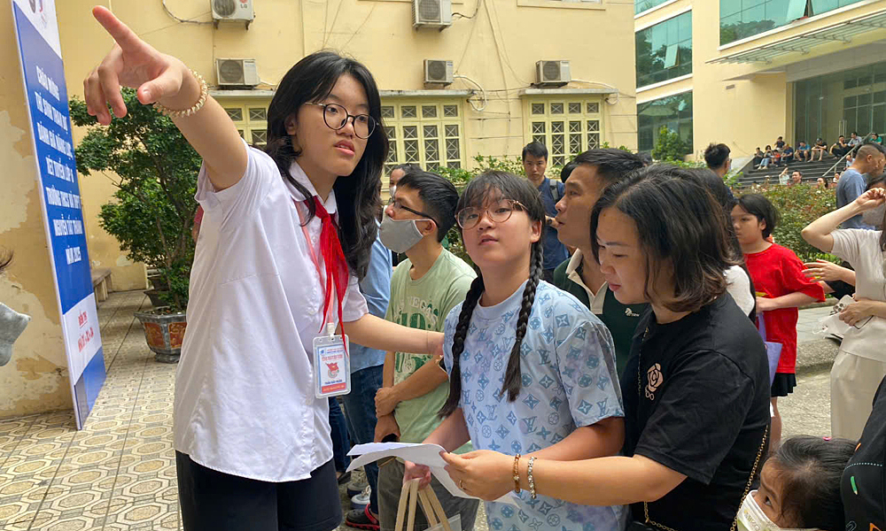 Tình nguyện viên hướng dẫn thí sinh thi vào lớp 6 trường THCS và THPT Nguyễn Tất Thành, Hà Nội, sáng 31/5. Ảnh: Bình Minh