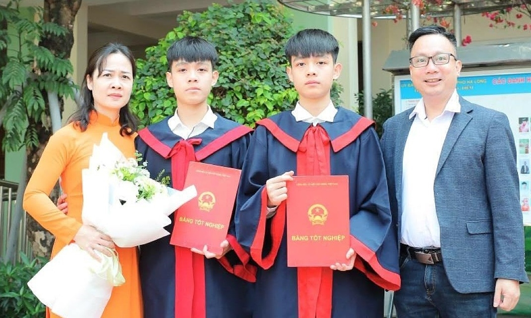 Ngoài là thủ khoa chuyên Lý, Tùng Lâm dẫn đầu toàn trường chuyên Hạ Long với tổng điểm xét tuyển 46,75/50 (ba môn chung cộng môn chuyên hệ số 2). Điểm Toán của em là 9, Ngữ văn 8,75. Em trai Tuấn Lâm đạt 8,5 Toán, 8,25 Văn. Cả hai cùng lấy trọn vẹn 10 điểm tiếng Anh.