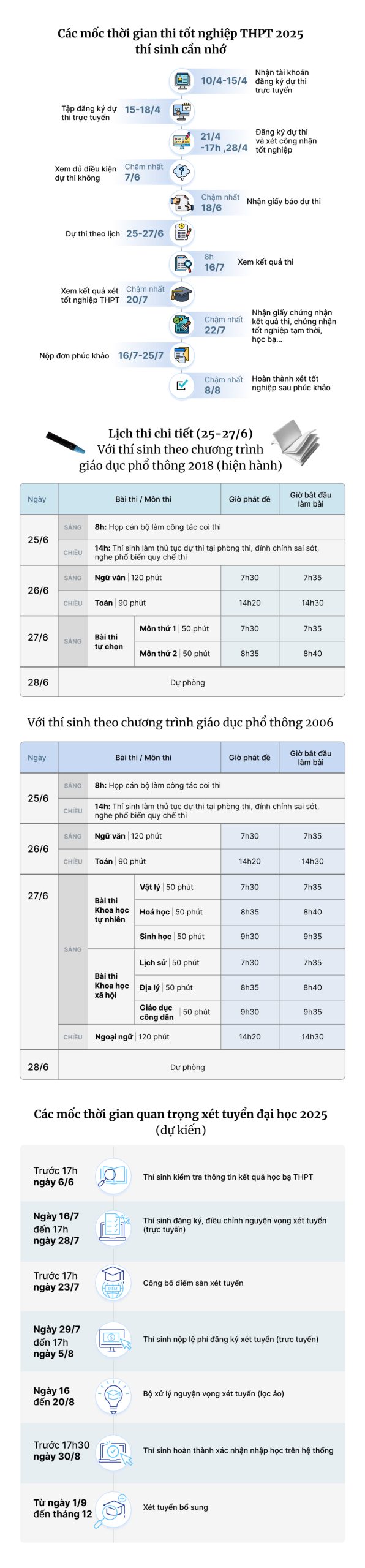 Kỳ thi tốt nghiệp THPT năm 2025 diễn ra ngày 25-27/6, thí sinh nhận kết quả ngày 16/7 và bắt đầu đăng ký nguyện vọng xét tuyển đại học.