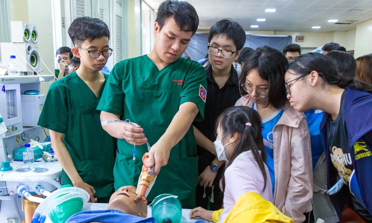 Học sinh tham quan mô hình thực hành của Đại học Y Dược TP HCM, tháng 4. Ảnh: UMP