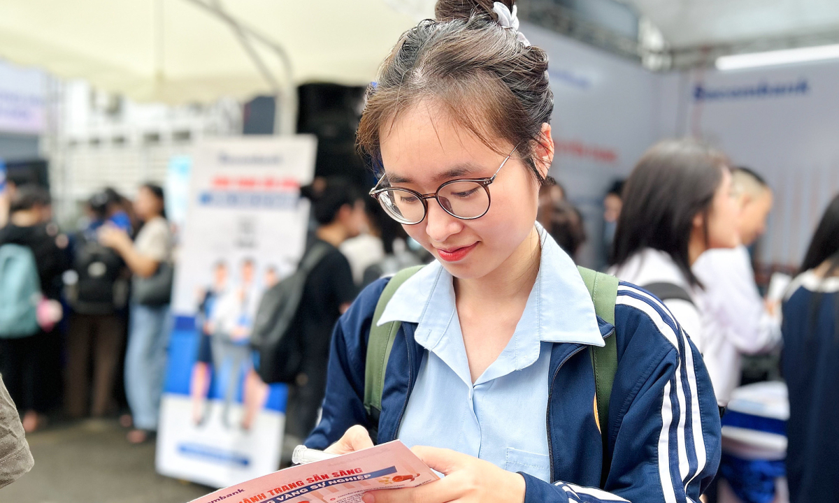 Sinh viên Học viện Ngân hàng đi tìm hiểu công việc tại Hội chợ việc làm - Cầu nối nhân lực, ngày 22/4. Ảnh: Dương Tâm