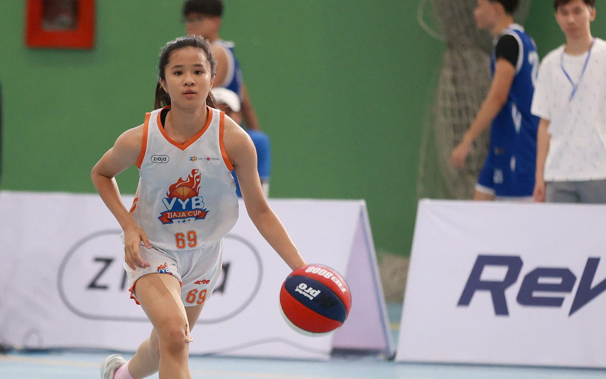 Phương Linh (áo trắng) trong một pha dẫn bóng sang phần sân đối thủ trong trận chung kết giải Bóng rổ trẻ VnExpress – Ziaja Cup, sáng 1/6. Ảnh: Đức Đồng