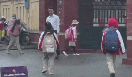 Thầy Bền đứng chào học sinh mỗi sáng ở cổng trường Tiểu học Trần Nhân Tông. Video: Phụ huynh cung cấp